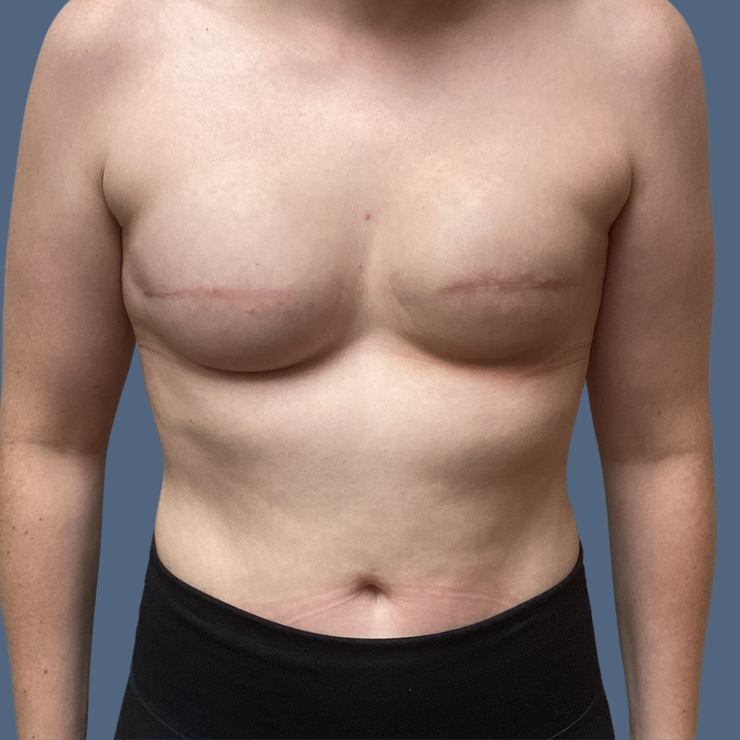 This patient underwent bilateral mastectomies for breast cancer using an inframammary fold incision to preserve the nipple–areolar complexes. Immediate breast reconstruction was performed by Board-certified plastic surgeon Dr. Ruter during the same operative setting with implant placement and biologic mesh used as an internal bra for structural support.