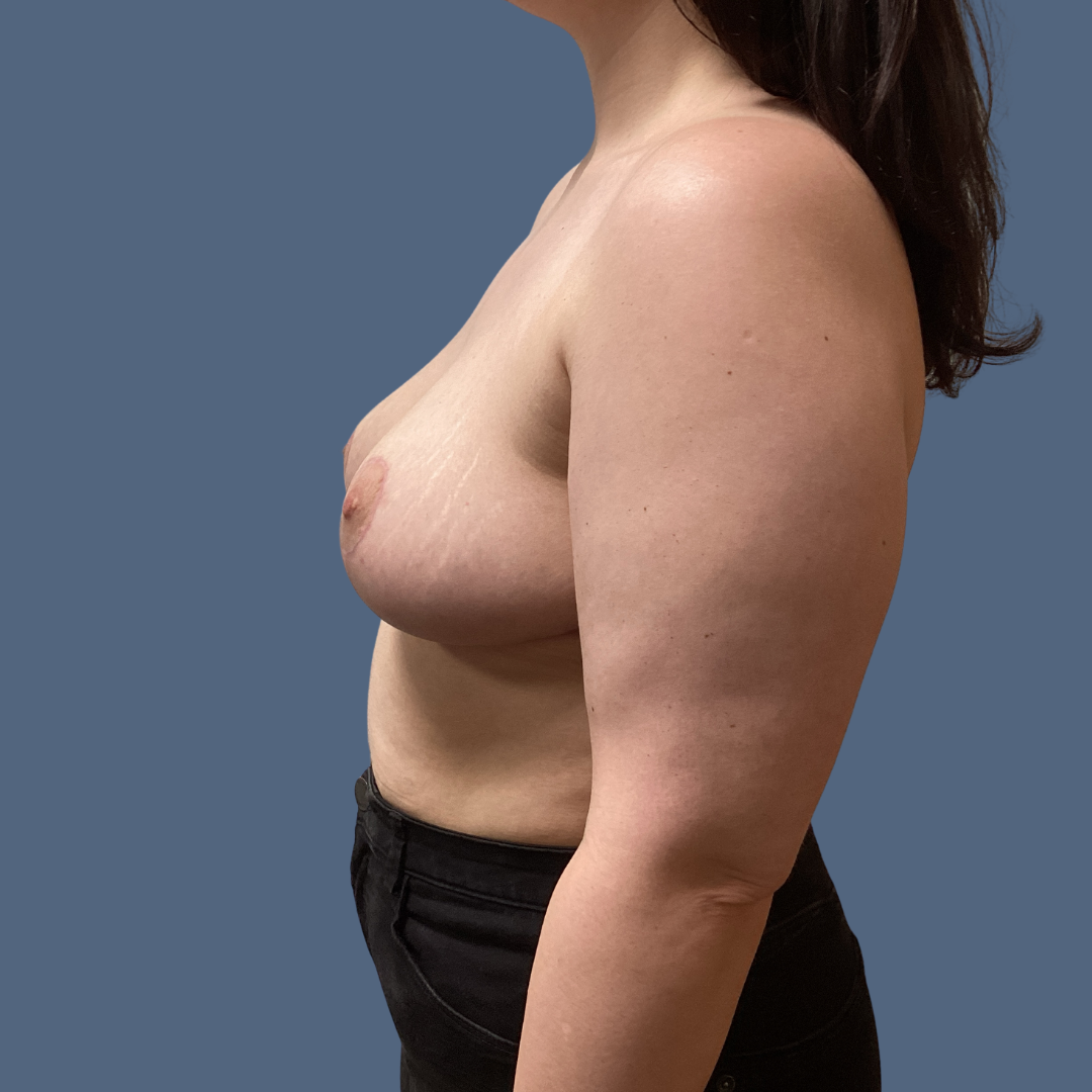 This 46-year-old patient underwent bilateral breast reduction by Board- certified plastic surgeon Dr. Ruter. Post-operative photos were taken during her one-month follow-up appointment. The patient is already pleased with her results, and the scars will continue to fade over time.